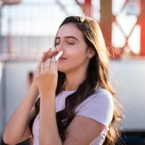 2. Aproxime o inalador do nariz e inspire através de uma das narinas, mantendo a outra tapada.